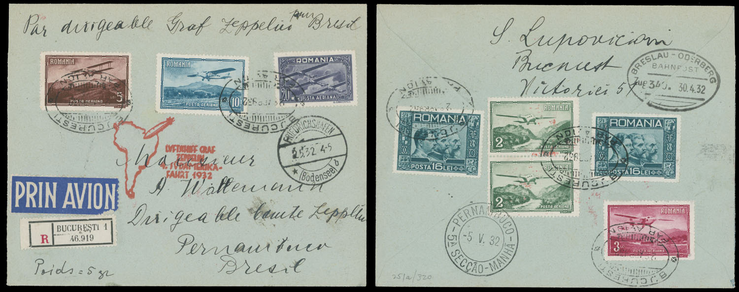 1932 (May 2-5), 4th South America Flight cover to Brazil, franked by eight stamps, including complete air post issue of 1931, tied by Bucharest oval date stamps, Friedrichshafen connection and vermilion confirmation markings, Pernambuco arrival hs on reverse, F/VF, Sieger #157, Est. $300-$350, Scott #C17-21