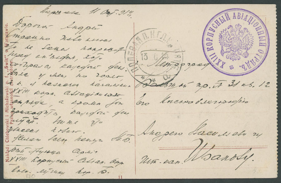 1914, free-frank postcard from 23rd Corps Aviation Unit, addressed to Petrograd, Field PO ”13.10.14” date stamp is alongside, mostly VF, Est. $150-$180