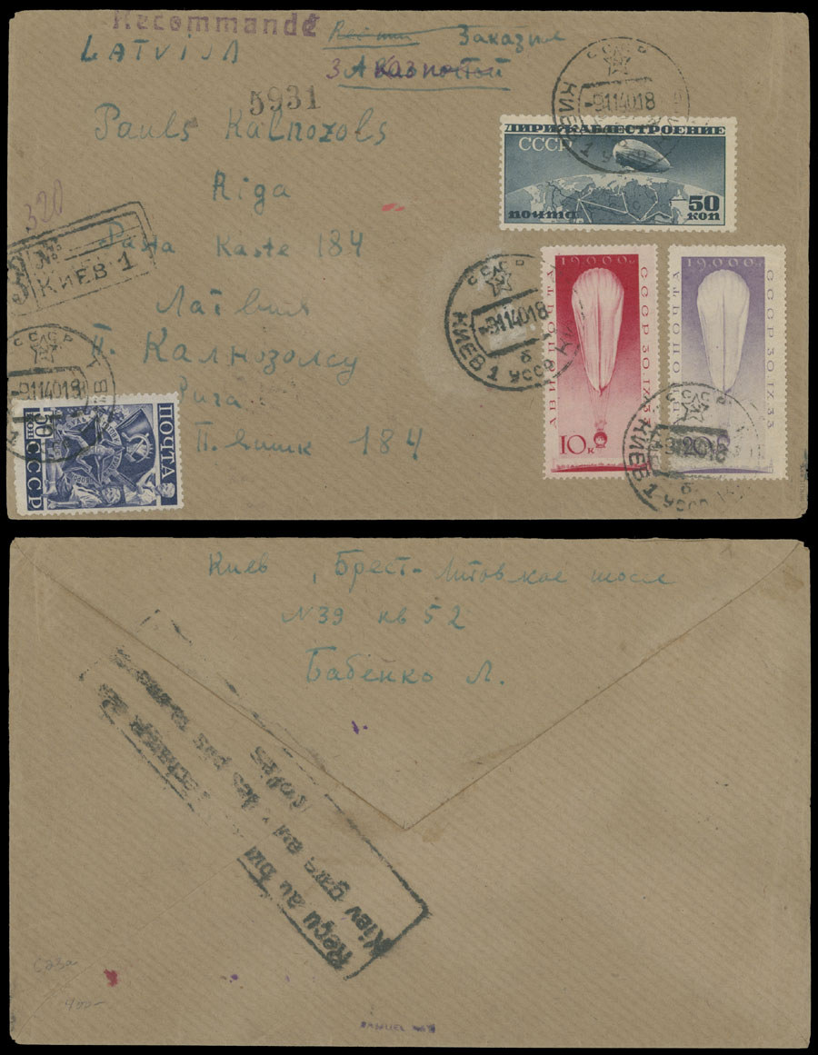 1931, Airship over the Arctic Region, 50k dark gray blue, error of color used in 1940 together with Stratostat ”C.C.C.P. 1” 10k carmine and 20k violet on registered cover from Kiev to Riga, tied by ”9.11.40” date stamps, boxed black postal handstamp ”Received in Kiev Train Station Post Office in damaged condition” on reverse, violet ”Recommande” marking and number ”5931” placed upon arrival, no significant defects, F/VF and very rare usage of No. C23a, Est. $1,000-$1,200, Scott #C23a, C38-39
