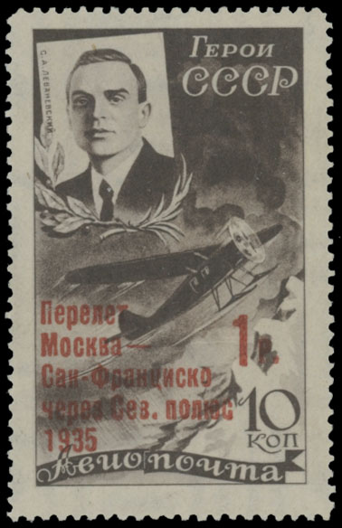 1935, Moscow – San Francisco Flight, red surcharge 1r on Levanevsky stamp of 10k dark brown, surcharge position 12 of 25-stamp setting, full OG, NH, VF, C.v. $1,275, Est. $1,000-$1,200 , Scott #C68