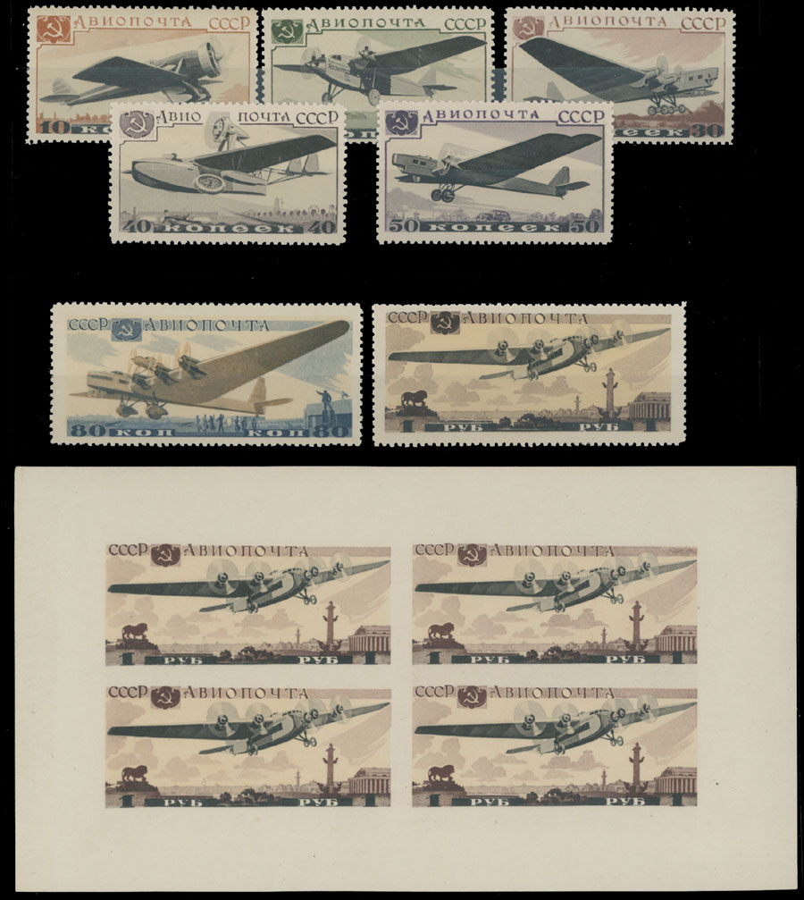 1937, Aviation Exhibition, 10k-1r, complete set of seven, and souvenir sheet of 1r x4, both items with full OG, NH, VF, C.v. $624, Est. $250-$300 , Scott #C69-75, C75a