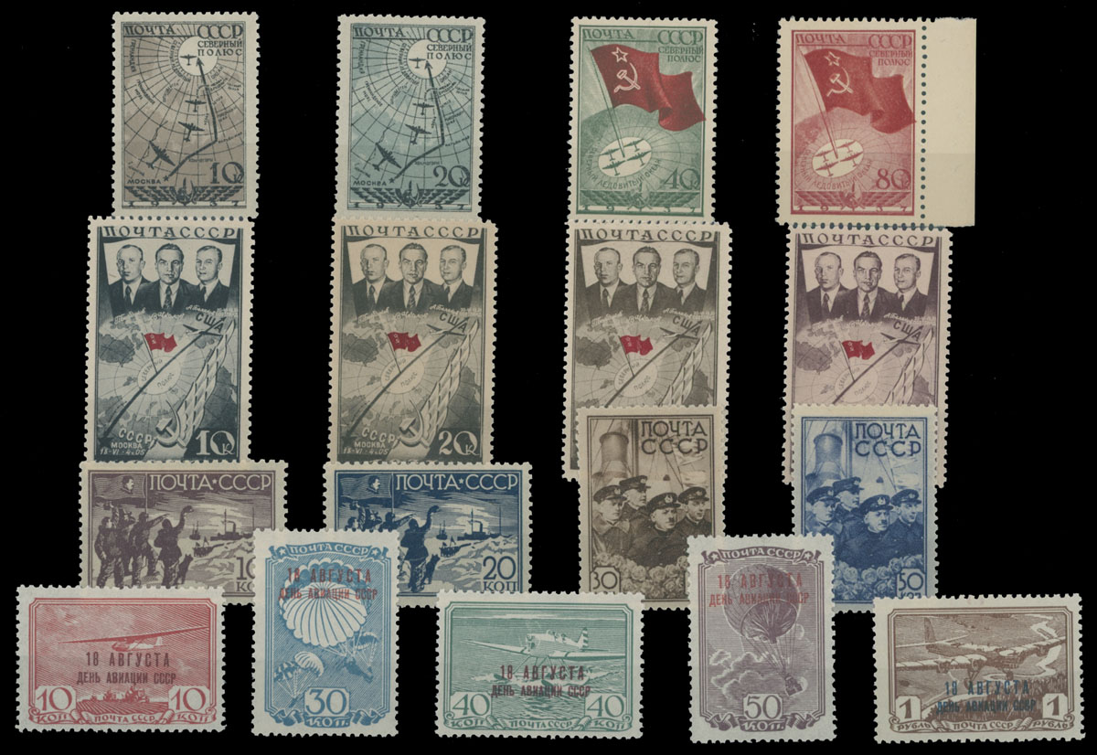 1938-39, North Pole Flight, First Trans-Atlantic Flight, Papanin’s Expedition and Aviation Day overprints, four complete sets, the total is 17 stamps, full OG, NH, VF, C.v. $335, Est. $250-$300 , Scott #625/46, C76-76D