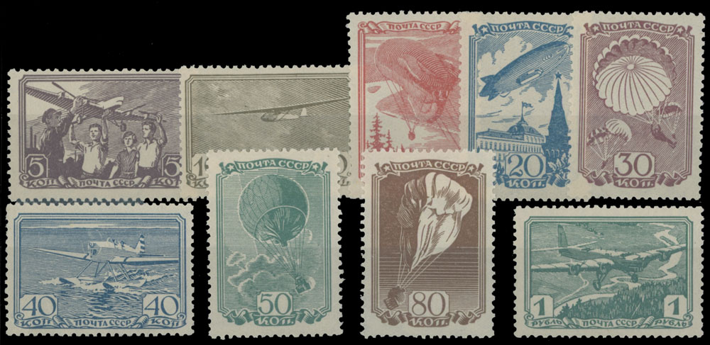 1938, Balloons and Airplanes, 5k-1r, complete set of nine, full OG, NH, mostly VF, C.v. $270, Est. $150-$200 , Scott #678-86