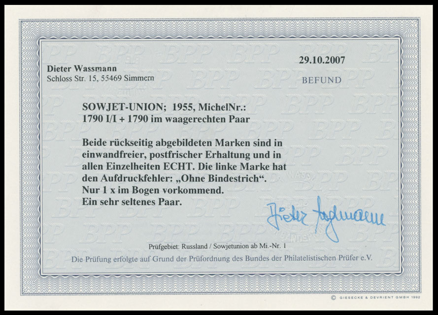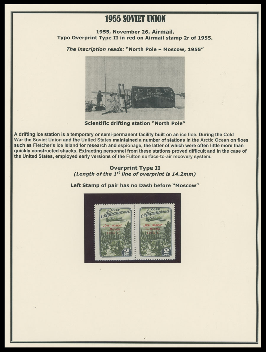 1955, North Pole Flight to Moscow, red overprint on definitive stamp of 2r black and green, horizontal pair, left stamp has ”No Dash” variety, arranged on illustrated page from a Collection, full OG, NH, VF, D. Wassmann certificate, Est. $250-$300, Scott #C96, var