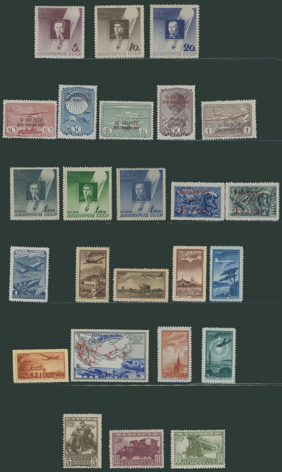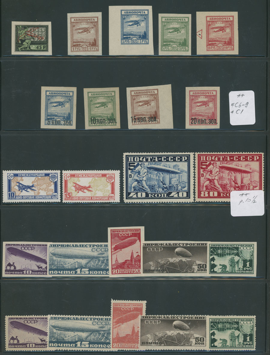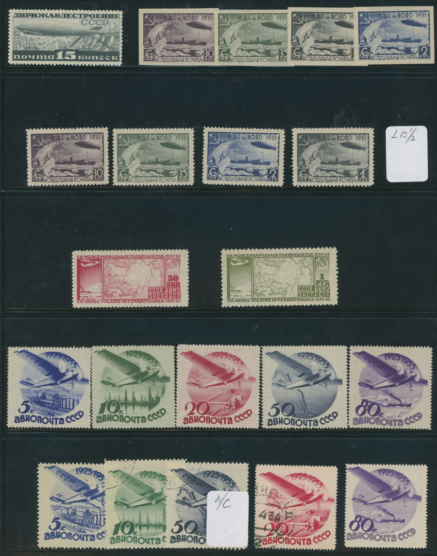 1922-49, over 60 mint stamps (4 – used, not counted), started with red Airplane overprint of 1922, then Fokker sets, Hague Air Post Conference, Zeppelin issue of 1930 (NH), Airships of 1931-32, Ice-Breaker ”Malygin” imperf and perf (L12½), Civil Aviation on watermarked paper and more, fresh quality overall, full/part of OG, F/VF, C.v. $2,400, Est. $800-$900, Scott #C1/90, E1-3