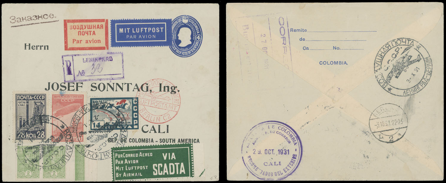 1931 (October 2-29), Colombian stationery envelope 4c ultra, uprated by five Soviet stamps, sent by registered mail by Pioneer Flight en route Leningrad-Berlin on October 2 with Berlin arrival of October 3, forwarded to Colombia by a steamship, received in Buenaventura on October 27 and posted on SCADTA Flight to Cali with final arrival on October 29, appropriate label is on front, mostly VF, Est. $200-$300, Scott #430, 434, C22a