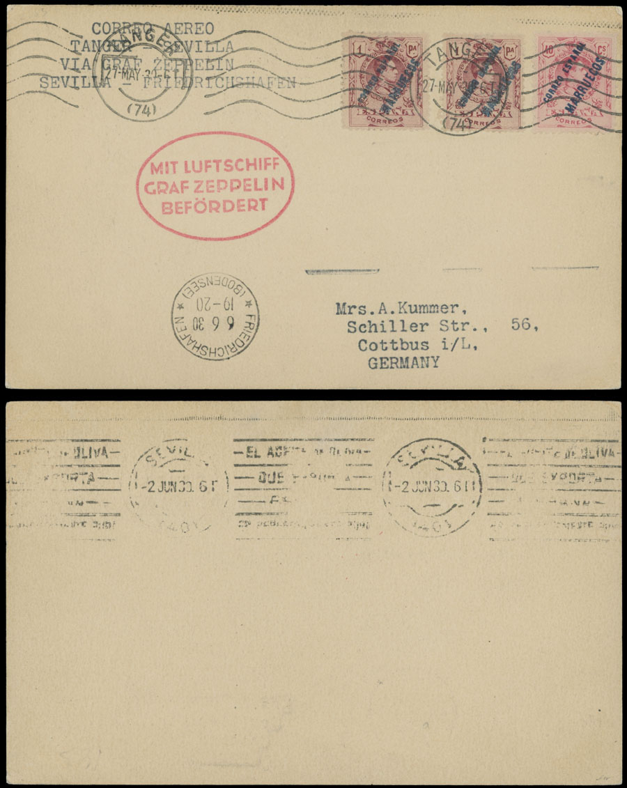 1930 (June 5-6), First South America Return Flight postcard from Tanger to Germany, franked by three overprinted values, tied by ”27.MAY.30” machine ds, Seville ”2.JUN.30”, red oval confirmation cachet, roller connection on reverse and Friedrichshafen ”6.6.30” arrival hs on front, VF and very rare, only 40 items flown, Sieger #64 XVII, C.v. €2,000, Est. $1,000-$1,200