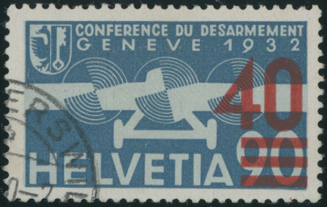 1936, Disarmament Conference, vermilion (error) surcharge 40c on 90c deep blue and gray, neat cancellation at the corner, VF and rare used, expertized by W. Liniger, C.v. $800, Zumstein #PA24a, C.v. CHF950=US$1,200, Est. $400-$500, Scott #C25a