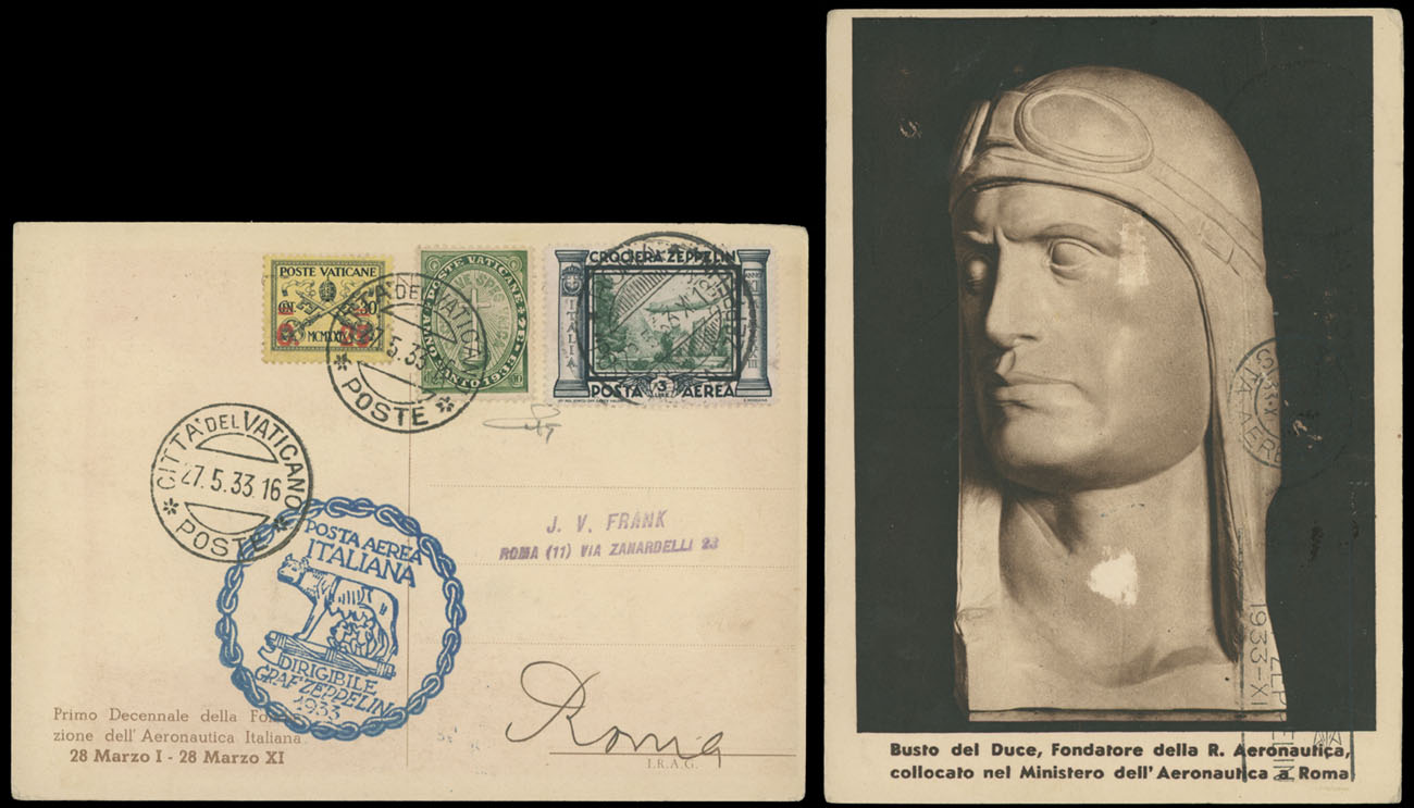 1933 (May 29-30), Italy Flight postcard, addressed to Rome, franked by two adhesives and uprated with Italian Zeppelin stamp of 3L, blue flight marking and Rome machine arrival ds on reverse, mostly VF, Sieger #208Va, C.v. €750, Est. $500-$600, Scott #14, B1