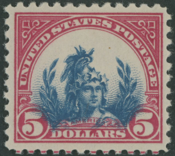 1923, Head of Freedom Statue, $5 carmine and blue, central vignette shifted to the bottom, perfect centering, full OG, NH, XF, C.v. $180, Est. $150-$180 , Scott #573 var