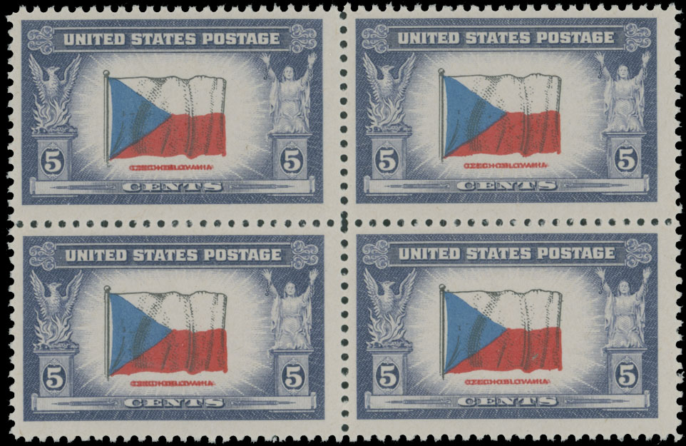 1943, Flag of Czechoslovakia, 5c multicolored, double impression of red engraved inscription ”Czechoslovakia”, block of four, full OG, NH, VF and rare multiple, a copy of PF certificate for block of 20, C.v. $2,400 as singles, Est. $1,200-$1,500, Scott #910a