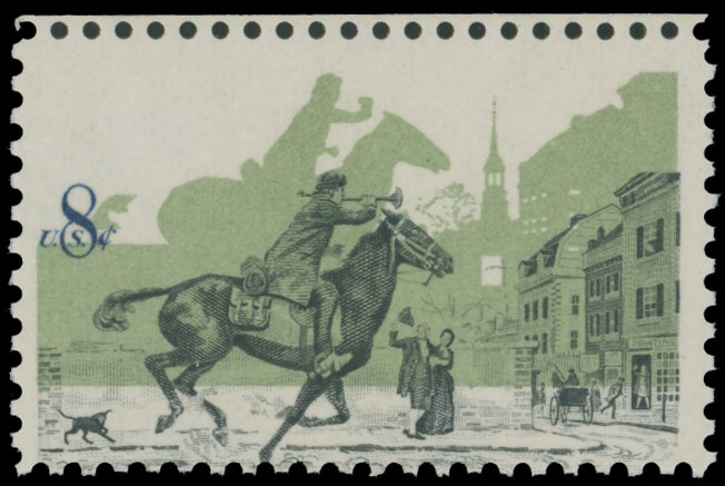 1973, American Bicentennial issue, Postrider, 8c multicolored, a single with red color missing and green color strongly shifted to the top, full OG, NH, VF centering for this rare error, C.v. $1,300++, Est. $500-$600 , Scott #1478a