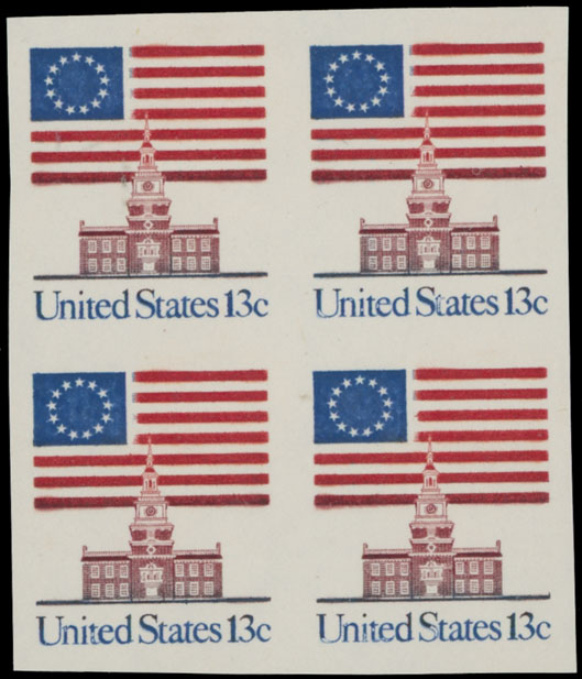 1981, 13-Star Flag over the Independence Hall, 13c dark blue, red and brown red, imperforate block with tagging omitted, full original even gum, NH, VF, imperforate block has C.v.$200, the same error with tagging omitted priced with ”-”, Est. $200-$250, Scott #1622Ch