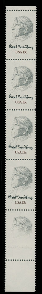 1978, Carl Sanburg, 13c black and brown, top and bottom sheet margin vertical transition strip of five, lower stamp has brown color completely omitted and just traces of black, full OG, NH, VF and rare multiple, PF certificate, C.v.$1,750++, Est. $800-$1,000, Scott #1731a