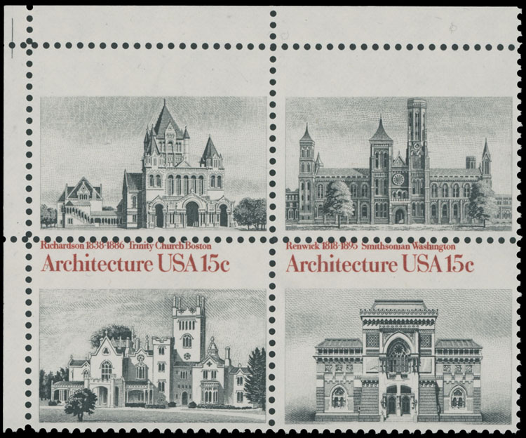 1978, Architecture, 15c black and red, top left corner margin se-tenant block of four, red color missing on top stamps, full OG, NH, VF, C.v. $400, Est. $200-$250 , Scott #1841b