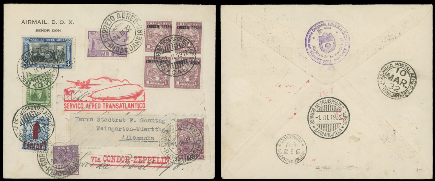 1932 (March 26-29), 1st Return SAF mixed franking cover from Colombia and Brazil, addressed to Germany, franked by seven Colombian and three Brazilian values, red Brazilian confirmation marking, Friedrichshafen ”29.3.32” arrival ds, mostly VF, Sieger #139B, C.v. €375, Est. $200-$225, Scott #C20a, C25