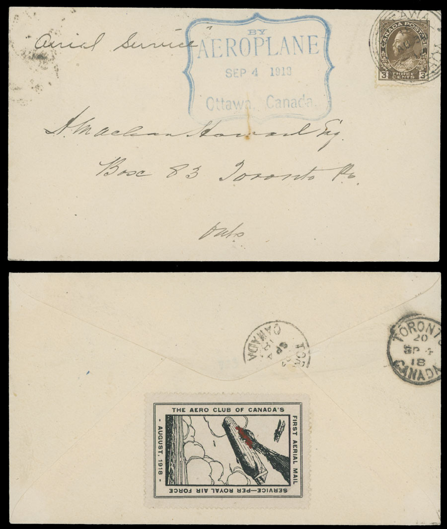 1918 (September 4), First Flight cover Ottawa – Toronto, franked by King George V Admiral stamp of 3c brown, Aero Club of Canada (25c) black and red on reverse, turquoise scroll cachet ”By Aeroplane. SEP.4.1918…” on front, Toronto ”SP.4.18” receiver on the back, minor facial soiling, otherwise VF and rare, C.v. $3,150, Unitrade C.v. CAD$4,500, Est. $2,000-$2,500, Scott #CLP1
