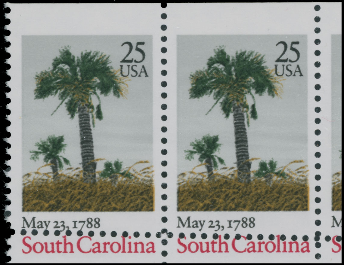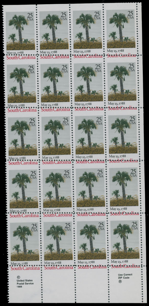 1988, South Carolina Ratification of U.S. Constitution, 25c multicolored, bottom right corner sheet margin block of 20, two stamps at top left have red color missing due to strong perforation shift, full OG, NH, VF, Scott catalogued this error as ”-”, Est. $600-$800, Scott #2343, b