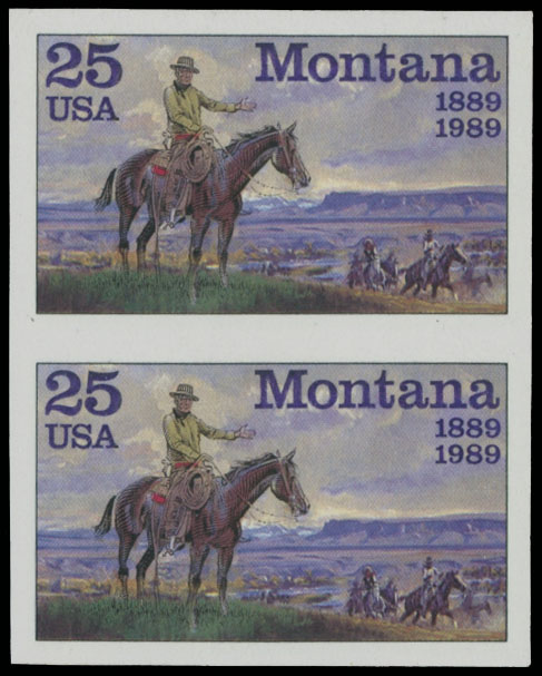 1989, 100th Anniversary of the Montana Statehood, imperforate plate proof of 25c multicolored (complete design) in vertical pair, nice margins all around, no gum as produced, NH, VF and scarce, this item erroneously considered as printer’s waste, Est. $300-$400, Scott #2401