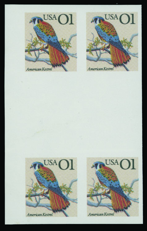 1991, Kestrel, imperforate proof of 1c multicolored, left sheet margin horizontal gutter block of four, full OG, NH, VF, C.v. $400 as two gutter pairs, Est. $200-$250 , Scott #2476 P