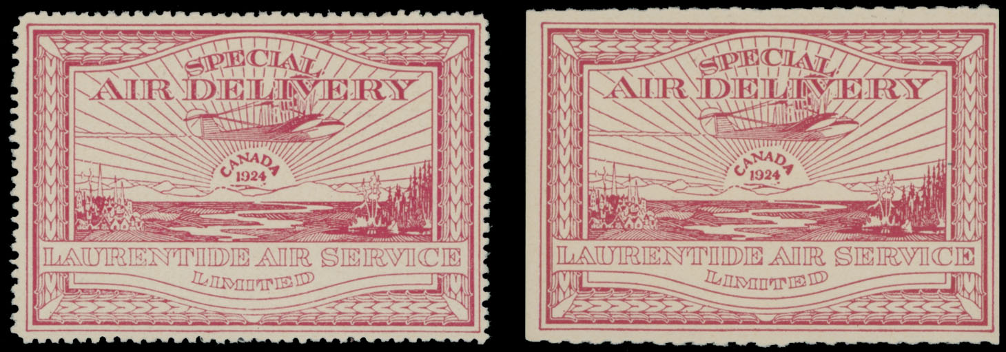 1924, Laurentide Air Service with added ”CANADA 1924”, (25c) red, two single stamps, perforated or rouletted at top and bottom, full OG, LH, VF, Unitrade C.v. CAD $350, Est. $120-$150 , Scott #CL3-4