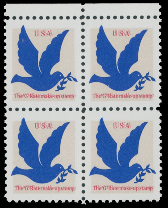 1994, Dove making-up ”G” rate, (3c) tan, blue and red, double impression of red color, top margin block of four, full OG, NH, VF, C.v. $700 as singles, Est. $250-$300 , Scott #2877b