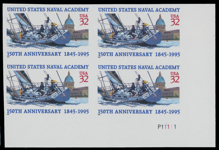 1995, Naval Academy, 32c multicolored, bottom right corner sheet margin imperforate block of four, plate No. P11111, full OG, NH, VF, this item considered to be from a printer’s waste, Est. $400-$500 , Scott #3001 imp