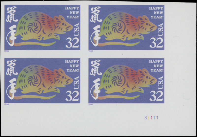 1996, Year of the Rat, 32c multicolored, bottom right corner sheet margin imperforate block of four with plate No.S1111, full OG, NH, VF, C.v. $650 as two pairs, Est. $250-$300 , Scott #3060a