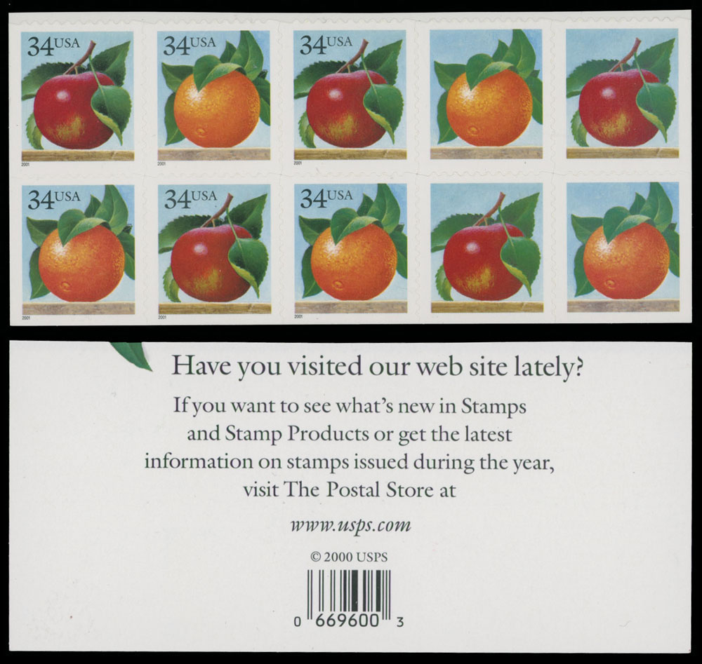2001, Apple and Orange, 34c multi, self-adhesive stamps on booklet pane of ten (5 se-tenant pairs, bottom part of complete booklet), two pairs at right have black (34 and USA) omitted, backing paper intact, fresh, VF and very rare, reportedly six error pairs recorded, Scott priced each pair with ”-”, Est. $2,000-$3,000, Scott #3492c
