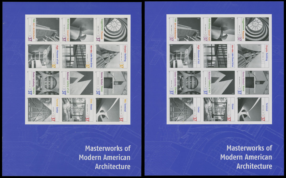 2005, Modern Architecture, 37c multicolored, self- adhesive se-tenant pane of 12, orange yellow color omitted on three stamps of the 2nd vertical row, backing paper intact, VF, C.v. $400, a common pane is included, Est. $200-$250 , Scott #3910m