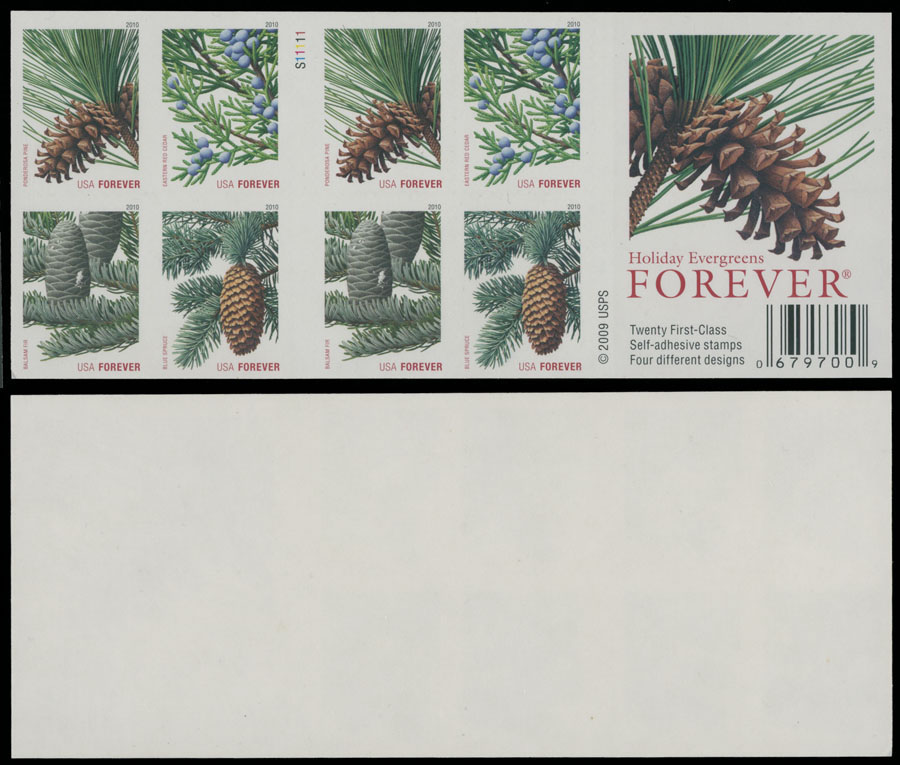 2010, Christmas issue, Coniferous, self-adhesive ”Forever” (44c) on one side booklet pane of eight values with die cutting omitted (no stamps on reverse), fresh and VF, C.v. $450, Est. $200-$250 , Scott #4481e