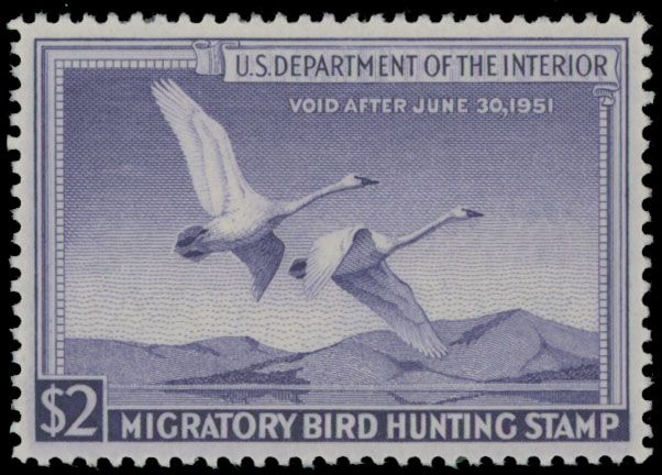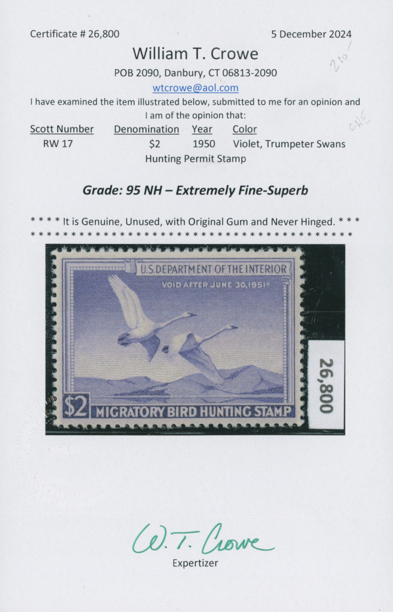 1950, Trumpeter Swans in Flight, $2 violet, perfectly centered single, full OG, NH, XF/Superb -95, W.T. Crove certificate, C.v. $90 for VF centering, Est. $150-$180 , Scott #RW17