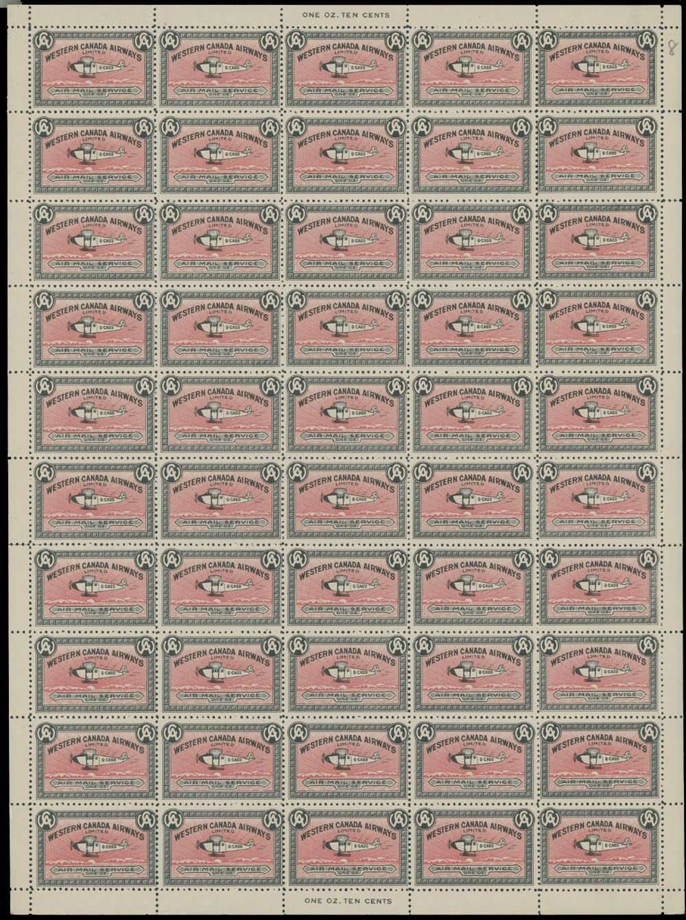 1927, Western Canada Airways, (10c) black with pink background, complete pane of 50 (5×10) with intact margins, some separations, full OG, NH, VF, Unitrade C.v. CAD$525 as singles, Est. $250-$300 , Scott #CL40