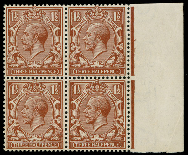 1912, King George V, 1½p red brown, Simple Royal Cypher watermark, right sheet margin block of four, upper right stamp with ”PENCF” variety (position R15/12), full OG, NH, VF, SG #362, a, C.v. £430++, Est. $200-$250 , Scott #161, a