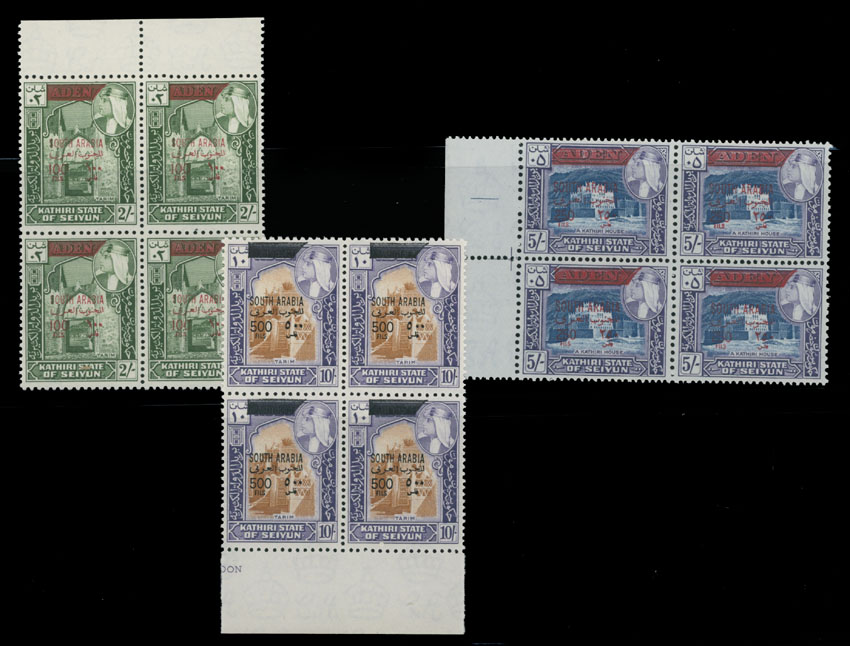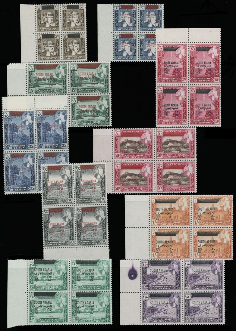1966, Sultan Hussein and Scenes, surcharged in red or black with ”South Arabia” and new denominations, 5f/5c-500f/10s, complete set in sheet margin blocks of four, full OG, NH, VF, SG #42/54, C.v. £220++, Est. $200-$250