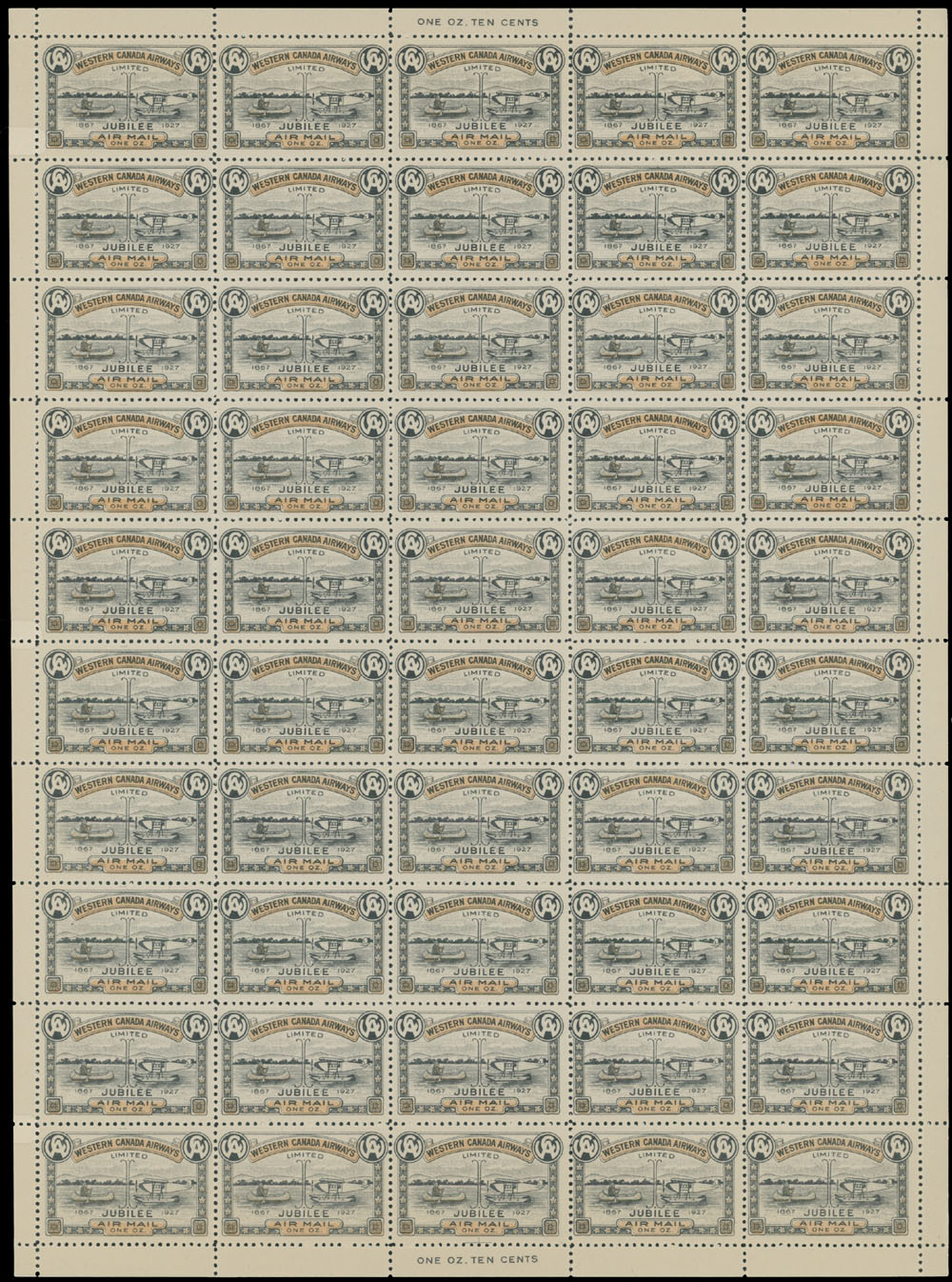 1927, Western Canada Airways Jubilee issue, (10c) black and orange, complete pane of 50 (5×10) with intact margins, minor separations, full OG, NH, VF, Unitrade C.v. CAD$1,200, Est. $500-$600 , Scott #CL41