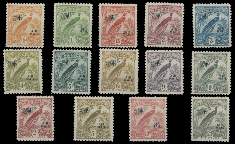 1931, blue black overprint ”Air Mail” and Airplane on Birds of Paradise with date scroll, ½p-£1, complete set of 14, full OG, NH or very light trace of hinge on the high value (looks NH), mostly VF, C.v. $366, SG #163/176, C.v. £300, both values for hinged sets, Est. #300-$400, Scott #C14-27