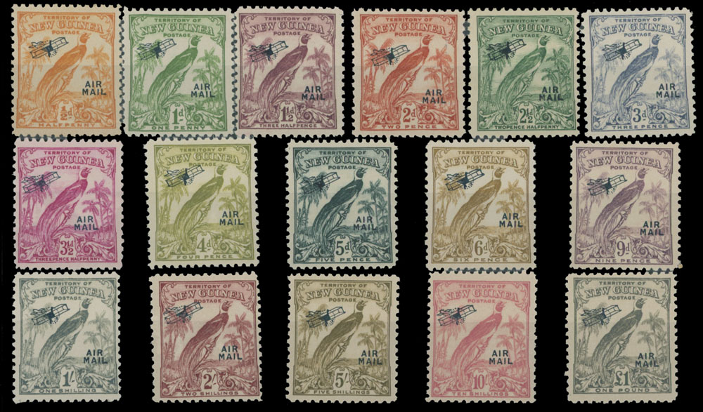 1932-34, blue black overprint ”Air Mail” and Airplane on Birds of Paradise without dates, ½p-£1, complete set of 16, full OG, NH, mostly VF, C.v. $312, SG #190/203, C.v. £275, both values for hinged sets, Est. #300-$400 , Scott #C28-43