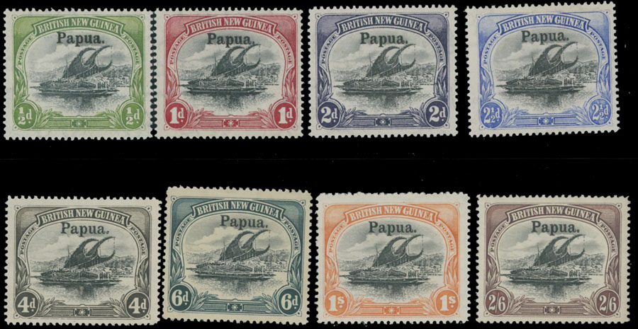 1906, black large overprint ”Papua” on British New Guinea stamps of ½p-2s6p, complete set of eight, full OG with some foxing on 1s, NH or VLH (6p), mostly VF, C.v. $593, SG #19/26, C.v. £450, both values for hinged sets, Est. $500-$600, Scott #11-18