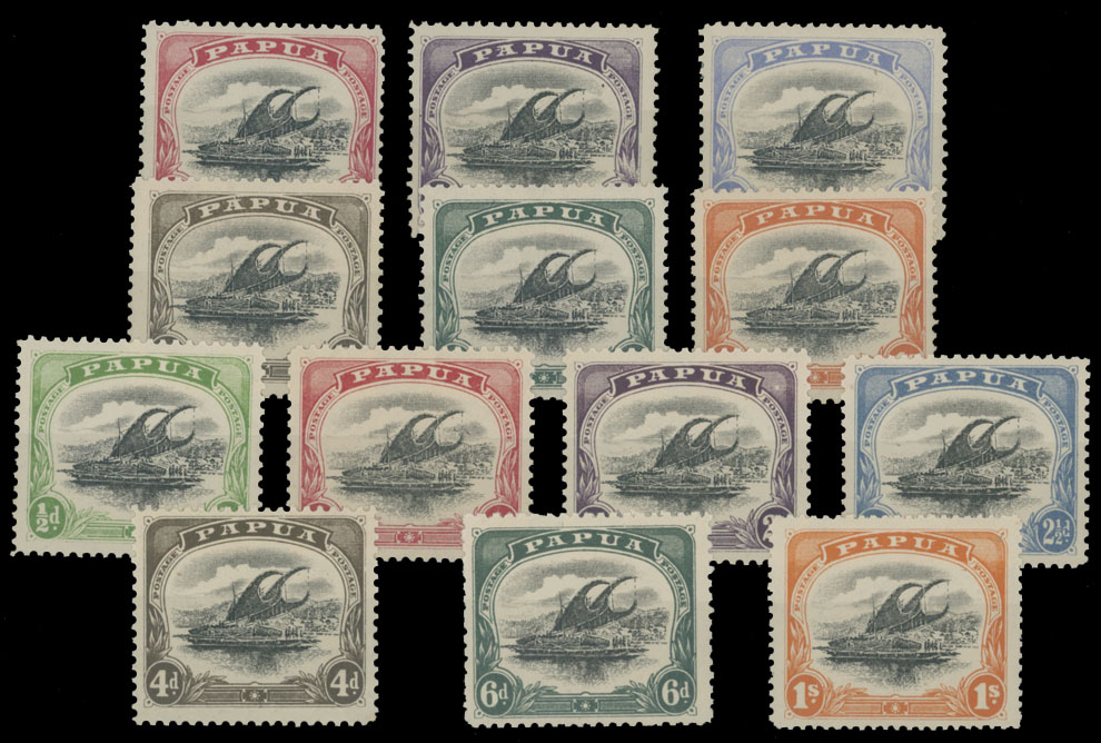 1907-10, Lakatoi with small ”PAPUA” inscription, 1p-1s and ½p-1s, two complete sets of six and seven respectively, upright and sideways Crown and double lined A watermark, full OG slightly dry on a few stamps, NH, mostly VF, C.v. $216, SG #49/66, C.v. £240, both values for hinged, Est. $250-$300, Scott #28-33, 34-40