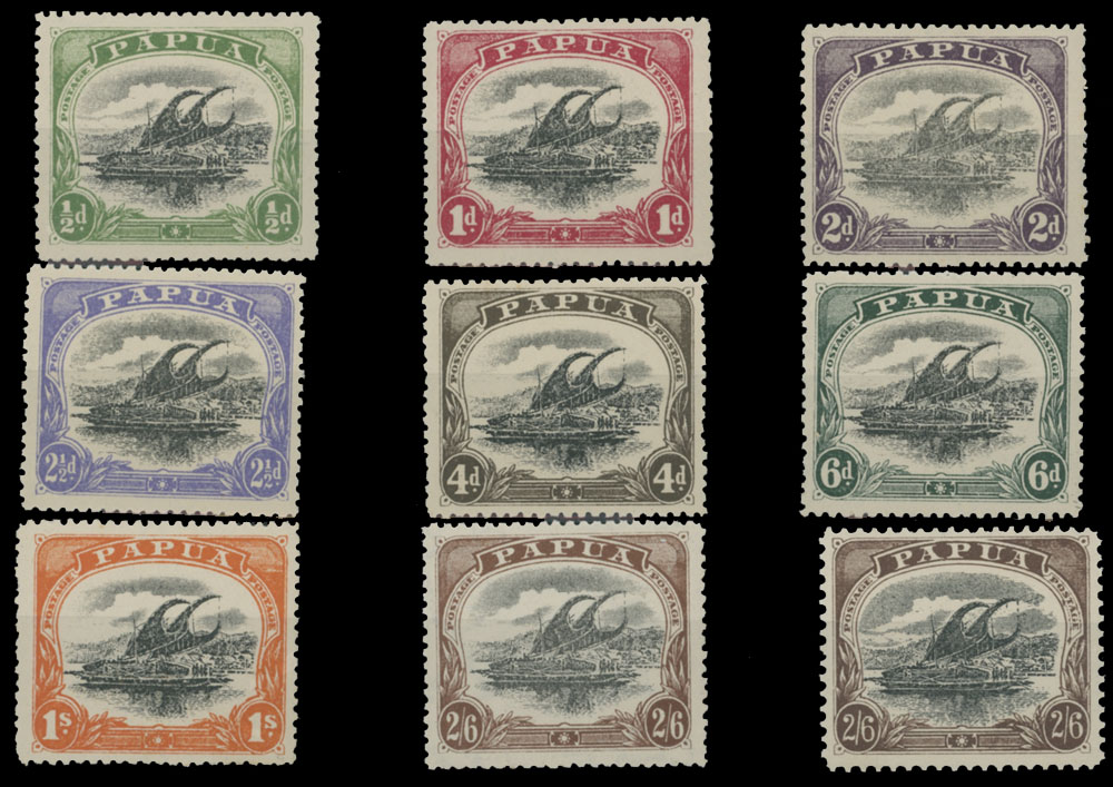 1911, Lakatoi with large ”PAPUA” inscription, ½p-2s6p, perforation 12½, complete set of eight with upright watermark Crown and double lined A (inverted on 2p, 2½p and 6p), in addition 2s6p with sideways watermark and perforation 11, all with full OG, NH, VF, C.v. $242, SG #75/82, 83, C.v. £205, both values for hinged items, Est. $250-$300, Scott #41-48, 49