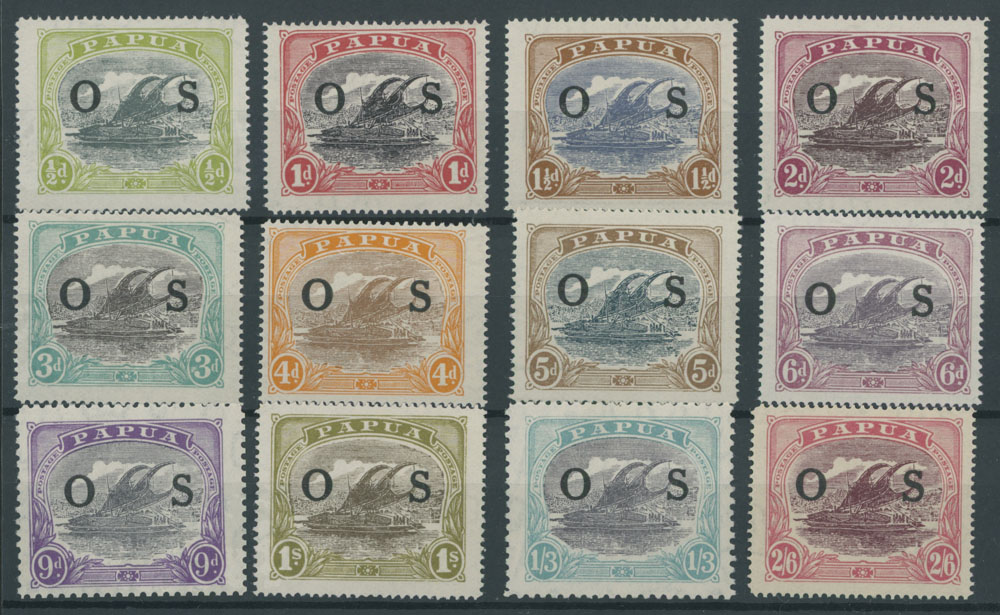 1931-32, black ”O S” overprints on Lakatoi two-color printing issue, ½p-2s6p, complete set of 12, full OG, NH, mostly VF, C.v. $170, SG #O55/O66, C.v. £130, both values are for hinged set, Est. $150-$1200 , Scott #O1-12