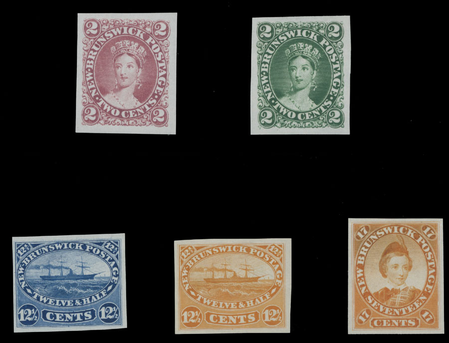 1860, Cents issue, trial color or plate proofs of Queen Victoria 2c rose and 2c green, Steamship 12c blue and 12c orange, Prince of Wales 17c orange, all printed on India paper, no gum as issued, VF, Unitrade #7TC, 7TCi, 10P, 10TCi, 11TC, C.v. CAD$415, Est. $150-$180, Scott #7, 10, 11