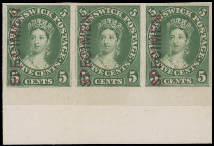 1860, Queen Victoria, imperforate plate proof of 5c yellow green, printed on India paper and mounted on card, bottom sheet margin horizontal strip of three, red vertical overprint ”Specimen”, types D-B-C, no gum as produced, VF, Unitrade #8Pii, iii, iv, C.v. CAD$450, Est. $150-$180, Scott #8
