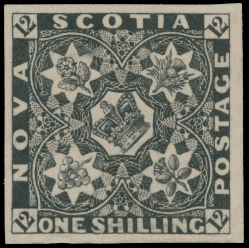 1851, Heraldic Flowers, imperforate plate proof of 1s in black, printed on thin card, no gum as issued, VF, Unitrade C.v. CAD$850, Est. $300-$400 , Scott #6