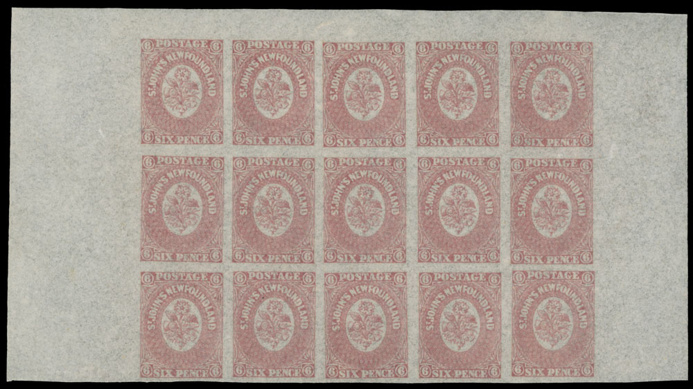 1861-62, 6p rose, three-side margin block of 15 (5×3) printed on thin hard wove paper, one stamp at the top row has tiny natural inclusion, full OG, NH, VF, Unitrade C.v. CAD$900 as singles, Est. $300-$400 , Scott #20