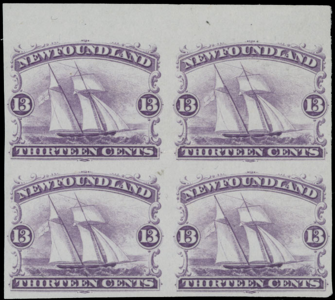 1865, Sailing Ship, trial color proof of 13c in dark red violet, top sheet margin block of four, printed on India paper, no gum as produced, VF, Unitrade #30TC, C.v. CAD$480, Est. $150-$200 , Scott #30