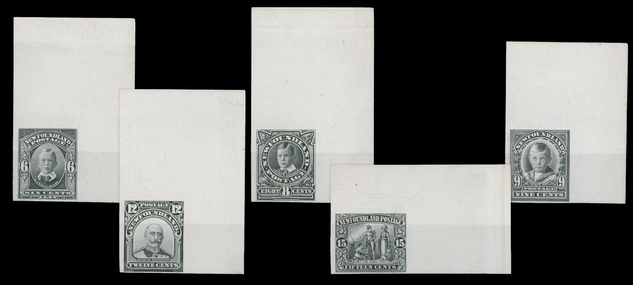 1911, plate proof or trial color proofs in black of 6c, 8c, 9c, 12c and 15c, only values of the set printed by Alexander & Son on white cards (other six stamps were produced by De La Rue on thin paper), all with top right corner margins, no gum as issued, VF and rare eye-catching unit, Minuse and Pratt #109P4, 110TC4/114TC4, Est. $300-$400, Scott #109-11, 113-14