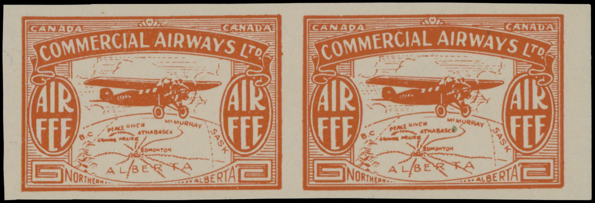 1930, Commercial Airways, Ltd., ”AIR FEE” (10c) orange, horizontal imperforate pair, full OG, NH, VF, Unitrade C.v. CAD$375, Est. $150-$180 , Scott #CL50c
