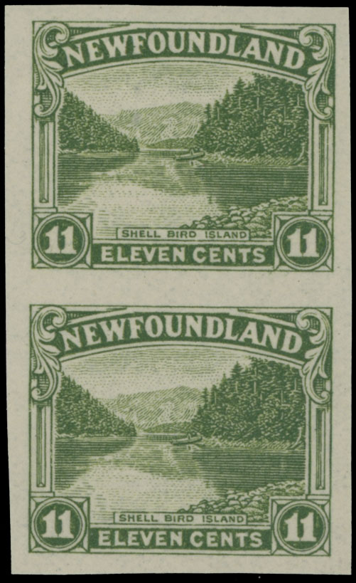 1923-24, Shell Bird Island, 11c olive green, vertical imperforate pair, full OG, VLH on top stamp, VF, Unitrade C.v. CAD$300, Est. $100-$120 , Scott #140a